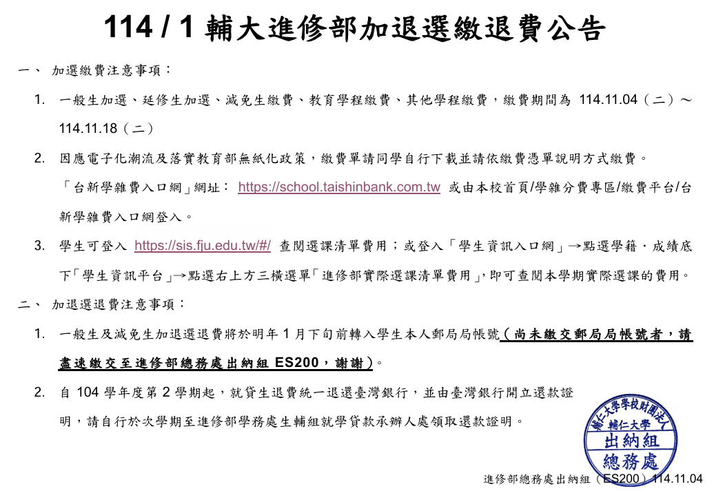 1. 一般生加選、延修生加選、減免生繳費、教育學程繳費、其他學程繳費,繳費期間為 114.11.04(二)~114.11.18(二)