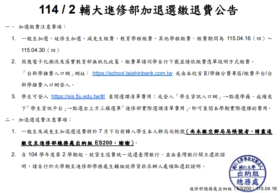 1. 一般生加選、延修生加選、減免生繳費、教育學程繳費、其他學程繳費,繳費期間為 115.04.16(四)~ 115.04.30(四)